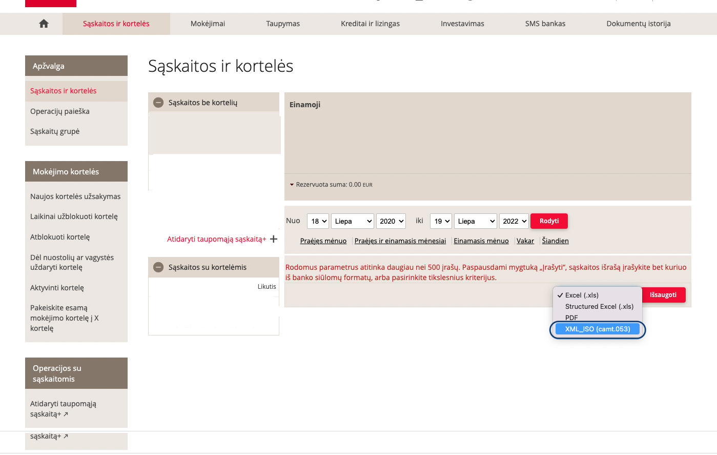 4. Pasirinkite formatą XML_ISO (camt.053).