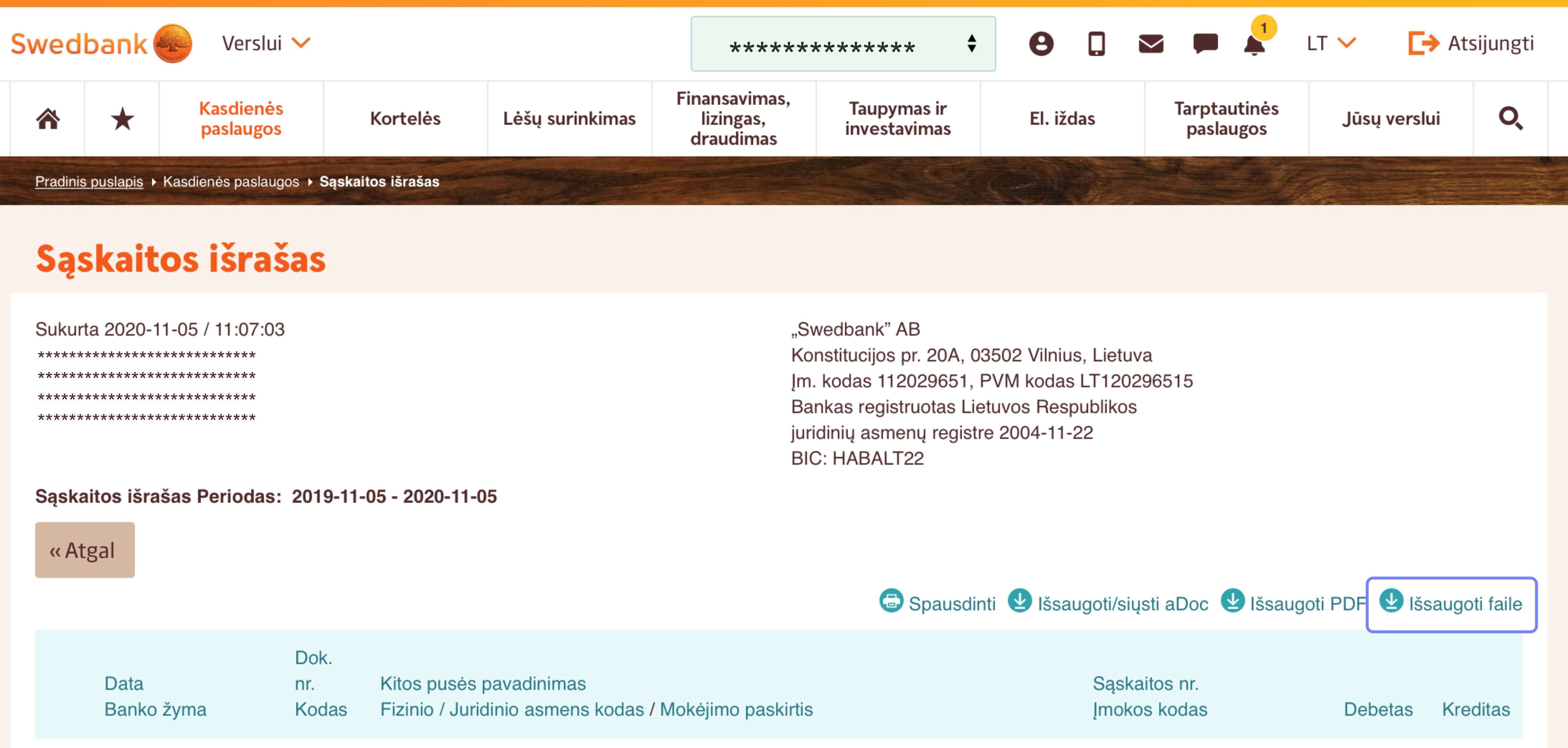 5. Gavę suformuotą sąskaitos išrašą pasirinkite